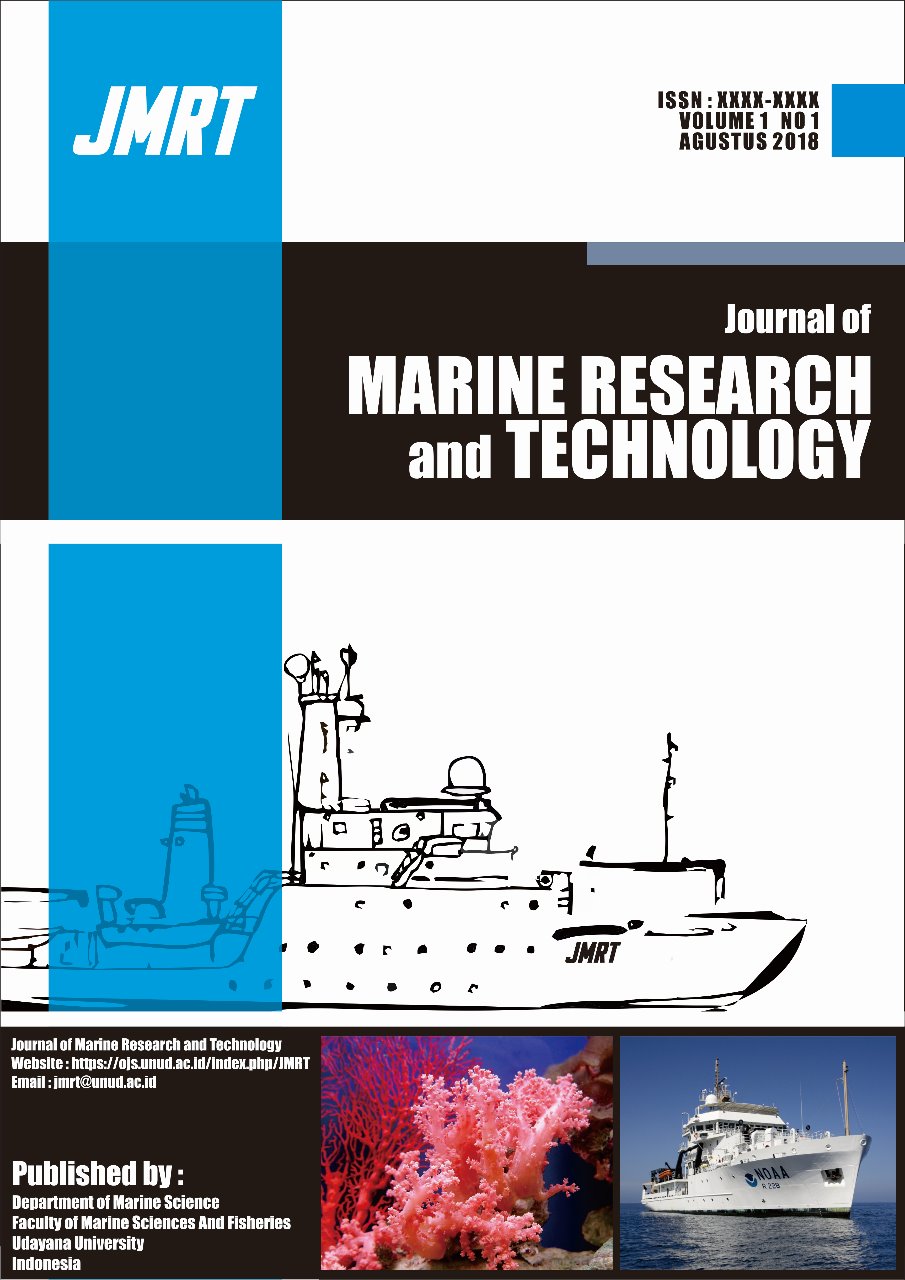 The Journal of Marine Research and Technology (JMRT) is an open-access scientific journal that aims to publish the cutting edge of all aspects of marine science, published by the Department of Marine Science, Faculty of Marine and Fisheries, Universitas Udayana.   JMRT is a peer-reviewed journal that publishes original articles and critical reviews of current issues in marine biology, marine culture, marine conservation, marine tourism, physical and chemical oceanography, and technology related to marine science, such as remote sensing and modeling.  The editorial manager system is an online manuscript submission, review, and tracking system.
