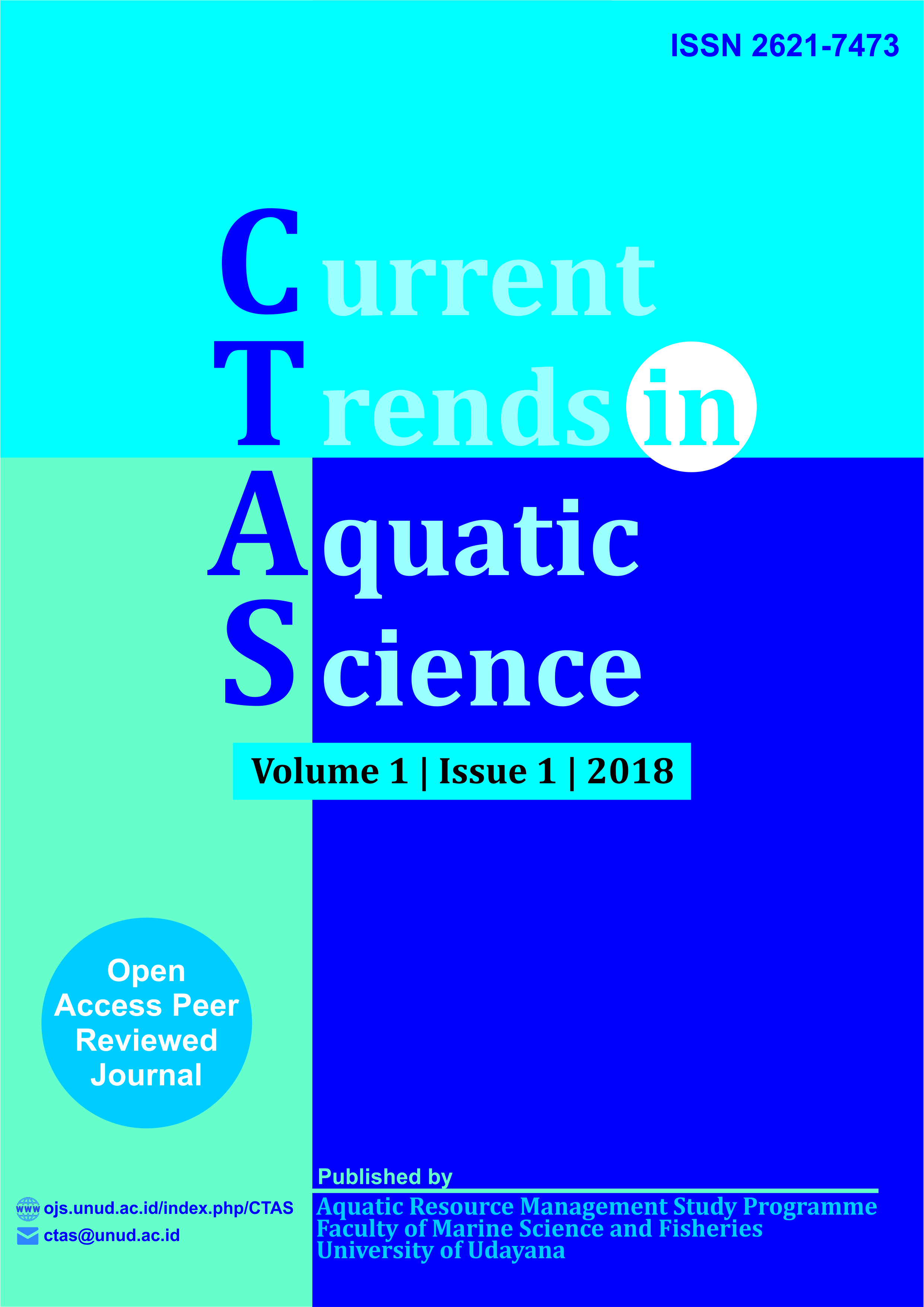 Current Trend in Aquatic Science (CTAS) has been registered with the number ISSN: 2621-7473 (online) and ISSN: 2621-7368 (print). This journal is a peer-reviewed (Open Access) journal and publishs articles based on scientific research by the Program Studi Manajemen Sumberdaya Perairan, Fakultas Kelautan dan Perikanan, Universitas Udayana, Indonesia. CTAS was published to develop and enrich scientific discussion for scholars who put interest in aquatic science in Indonesia. This journal covers several area of study, such as: limnology, aquatic ecology, aquatic ecotoxicology, aquatic microbiology, aquatic environmental pollution, aquatic bioremediation, applied biotechnology in aquatic science, marine and coastal environment, and fisheries management.