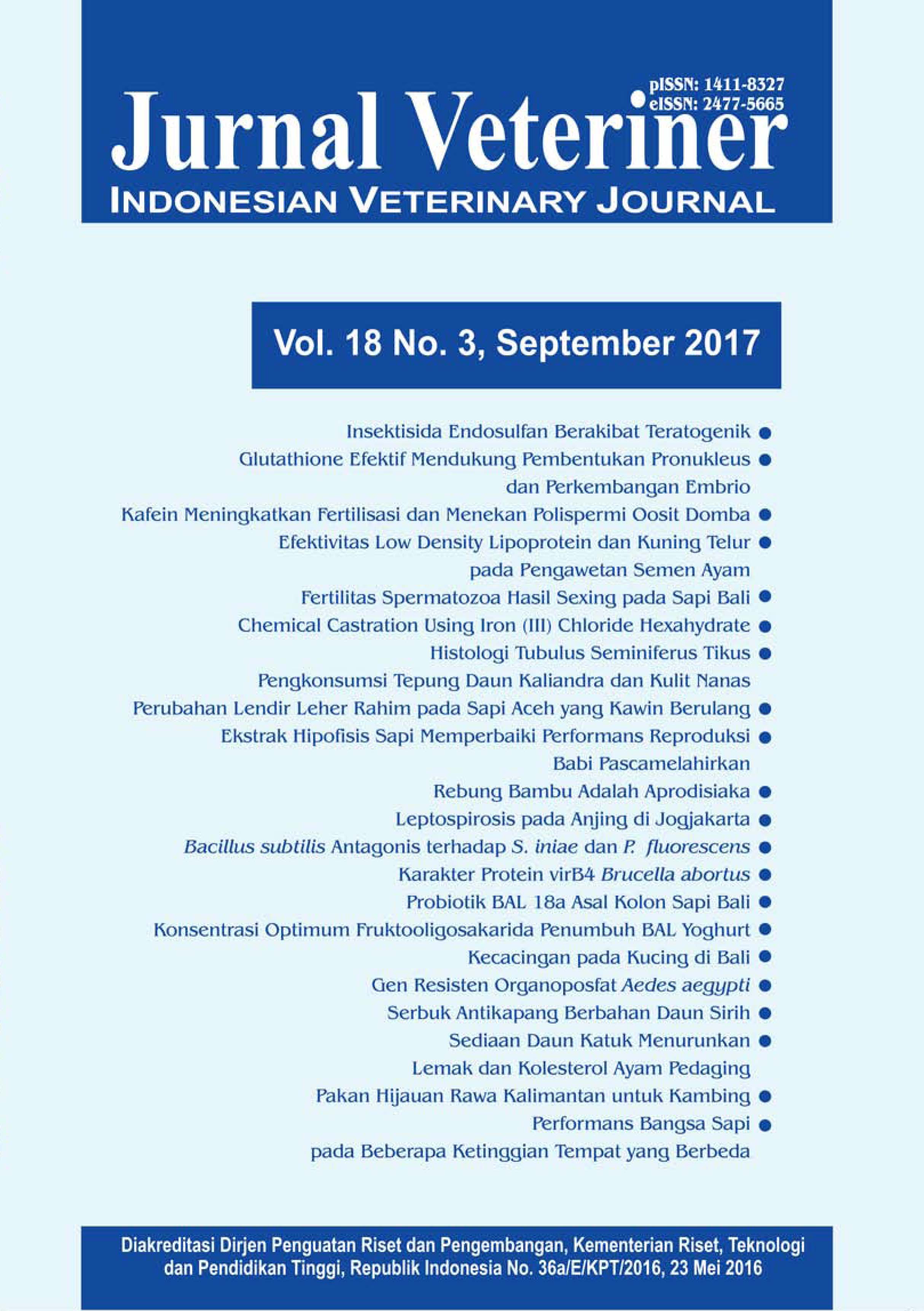 Jurnal Veteriner has been indexed and abstracted in  Clarivate Analytics products (formerly Thomson Reuters), DOAJ, CABI, EBSCO, Science and Technology Index (SINTA), Garba Rujukan Digital (GARUDA), Google Scholar, and other scientific databases.  Jurnal Veteriner also used Similarity Check to prevent any suspected plagiarism in the manuscripts.