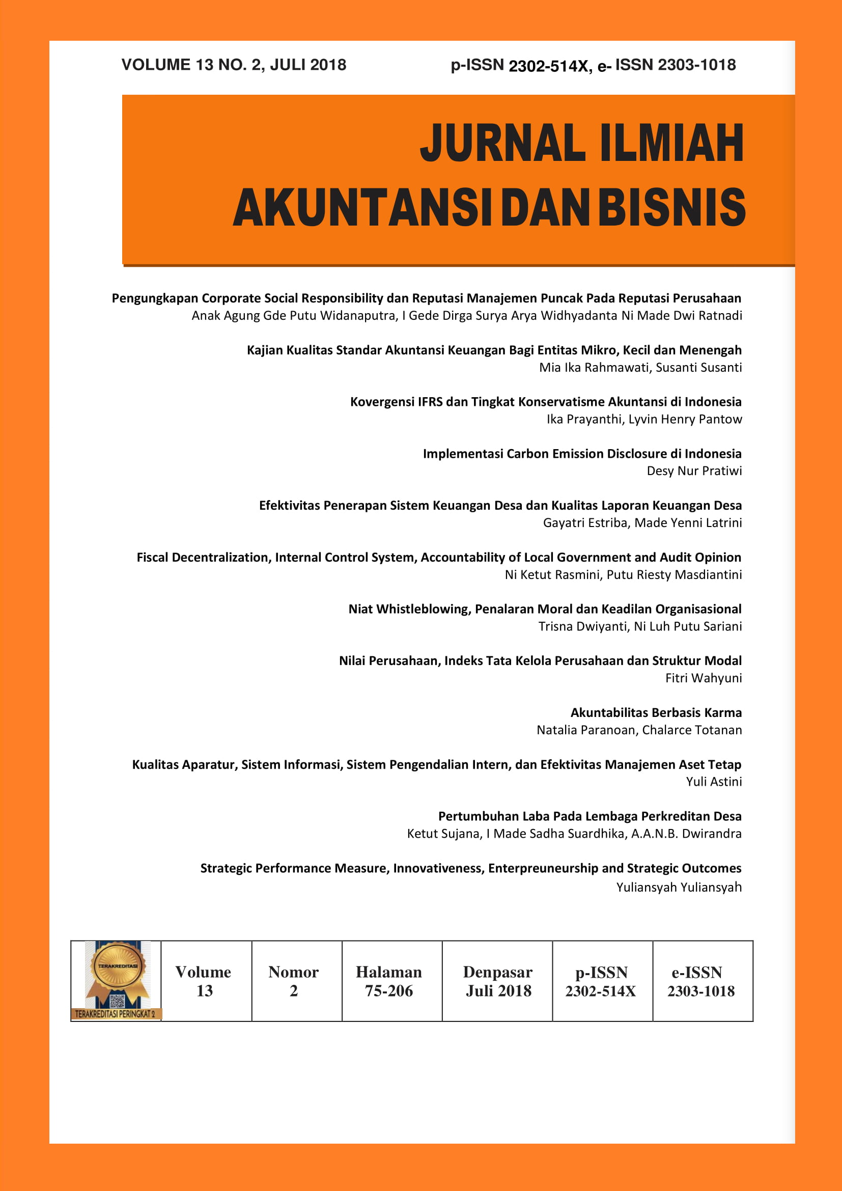Based on the Decree of the General Director of Strengthening the Research and Development, Ministry of Research, Technology and Higher Education of the Republic of Indonesia No. 21 / E / KPT/ 2018, Jurnal Ilmiah Akuntansi dan Bisnis (JIAB) was declared as an Accredited Scientific Journal with category Sinta 2” from Vol. 11 No.1 Tahun 2016 unti Vol. 15 No. 2 Tahun 2020