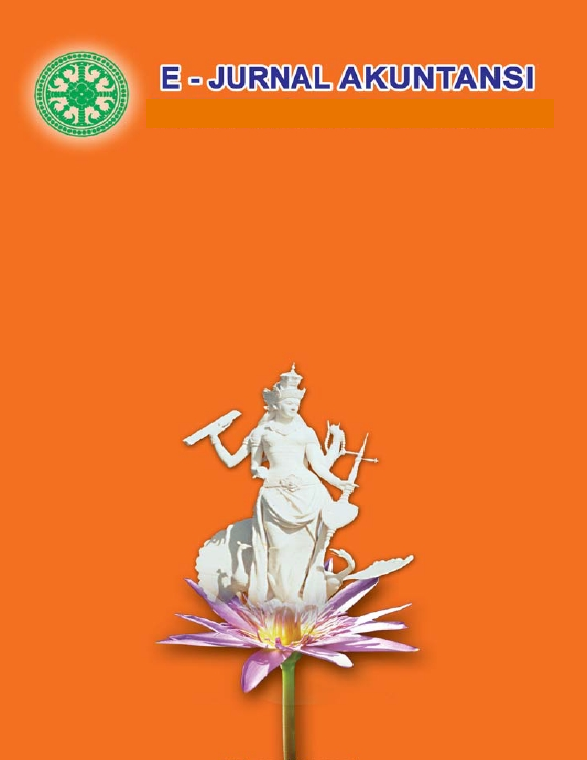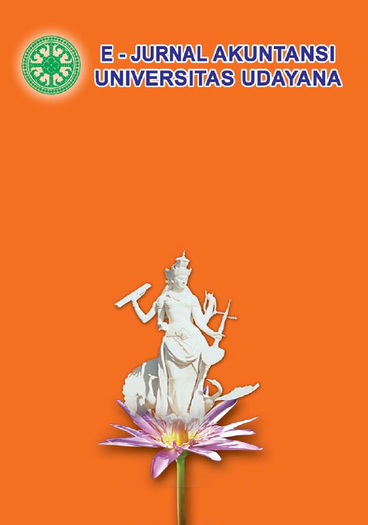 Vol 30 No 4 (2020)E-Jurnal Akuntansi [e-ISSN 2302-8556] is an electronic scientific journal published online once a month. E-journal aims to improve the quality of science and channel the interest of sharing and dissemination of knowledge for scholars, students, practitioners, and the observer of science in accounting. E-Jurnal Akuntansi accepts the results of studies and research articles that have not been published in other media. The Scientific E-Journal of Accounting (EJA) is published each month by the Accounting Department of Economic and Business Faculty in Universitas Udayana in collaboration with the Institute of Indonesia Chartered Accountants, Bali Region and The Indonesian Institute of Accountant-KAPD.