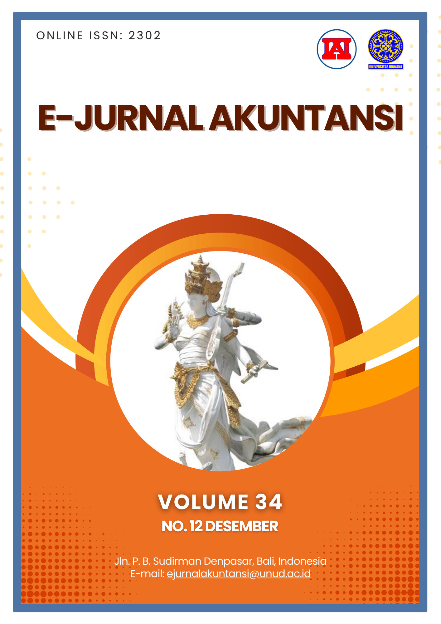 Vol 32 No 12 (2022)E-Jurnal Akuntansi [e-ISSN 2302-8556] is an electronic scientific journal published online once a month. The Scientific E-Journal of Accounting (EJA) is published by the Accounting by the Accounting Department of Economic and Business Faculty in Universitas Udayana in collaboration with the Institute of Indonesia Chartered Accountants, Bali Region and The Indonesian Institute of Accountant-KAPD. E-Jurnal Akuntansi is accredited in SINTA (Science and Technology Index) by the Ministry of Research and Technology of Republic of Indonesia, GRADE 5 (SINTA5) Decree No.30/E/KPT/2018 valid from Volume 23 Nomor 1 (2018) to Volume 34 Nomor 3 (2022) and re-accreditation to GRADE 3 (SINTA3) Decree No.23/E/KPT/2019 valid from Volume 27 Nomor 3 (2019) to Volume 31 Nomor 3 (2023).