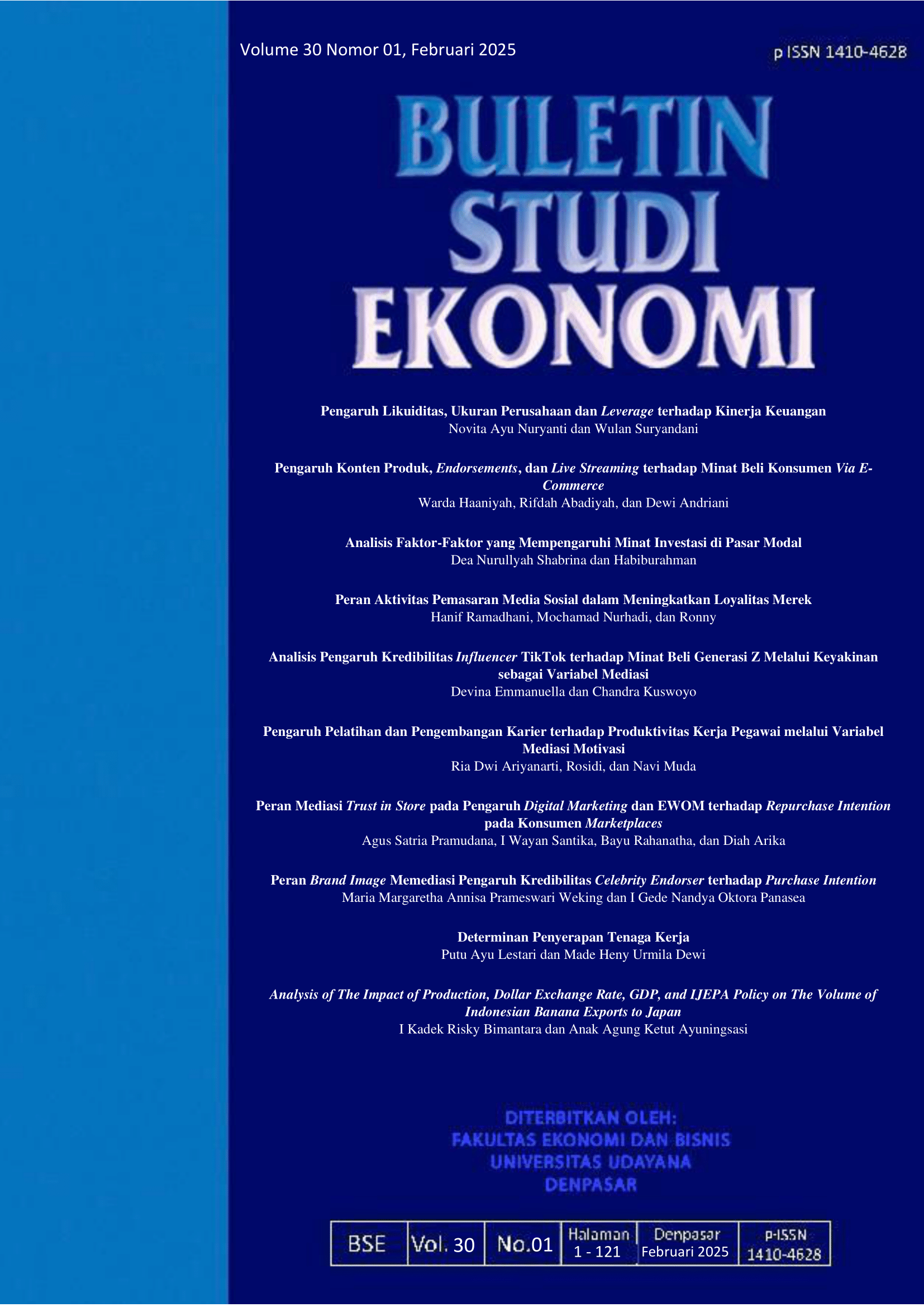 Buletin Studi Ekonomi is published by the Faculty of Economics and Business, Udayana University. Publish twice a year in February and August. Contains writing that is lifted from the results of research and results of ideas in the fields of economics, management science and accounting science. Print ISSN 1410-4628 and Online ISSN 2580-5312.