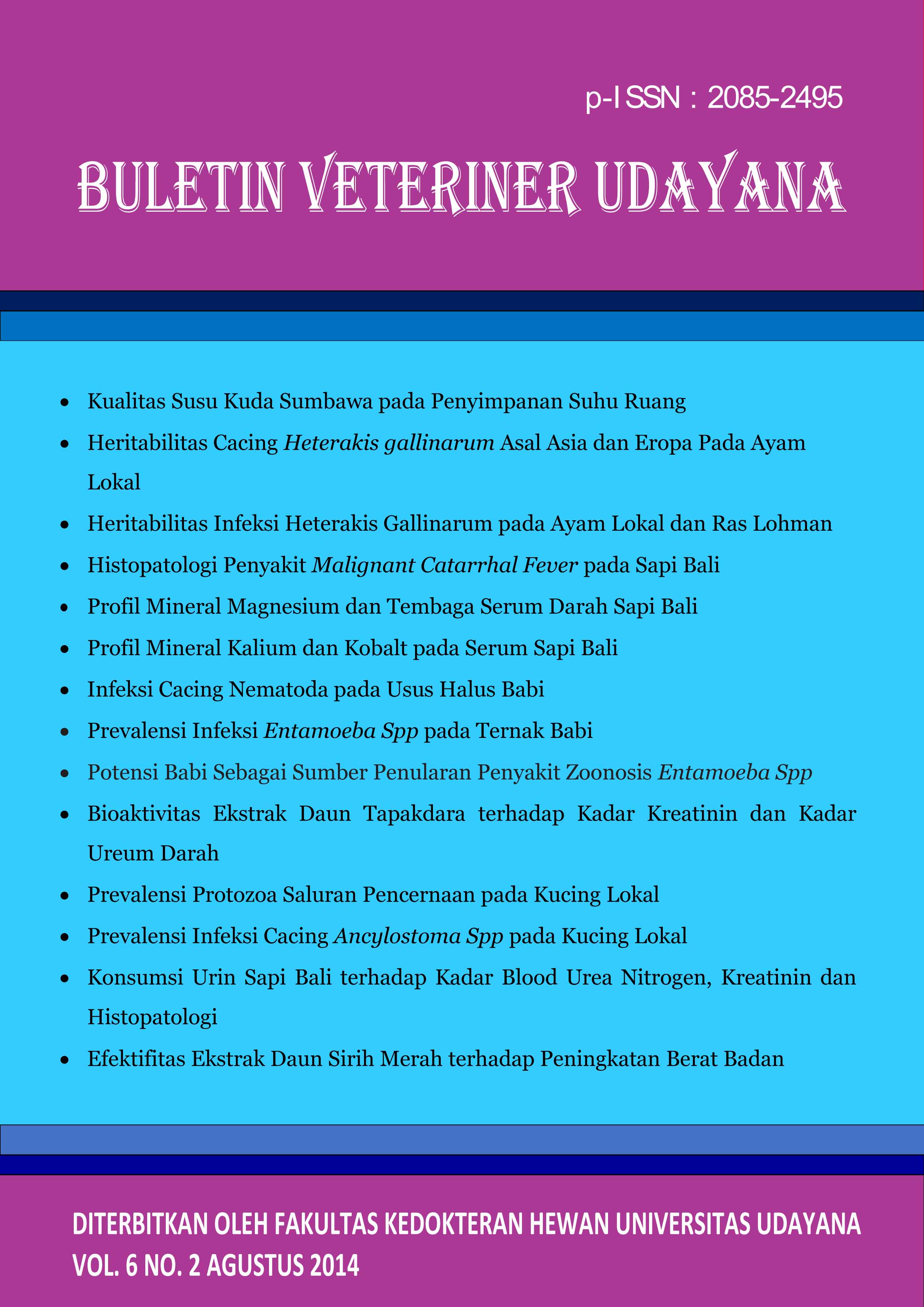 Vol 6 No 2 (2014)This journal is in a collaboration between The Faculty of Veterinary Medicine and Indonesian Small Animal Veterinarian Practitioner Asociation and Indonesian Veterinary Medical Asociation in Region Bali