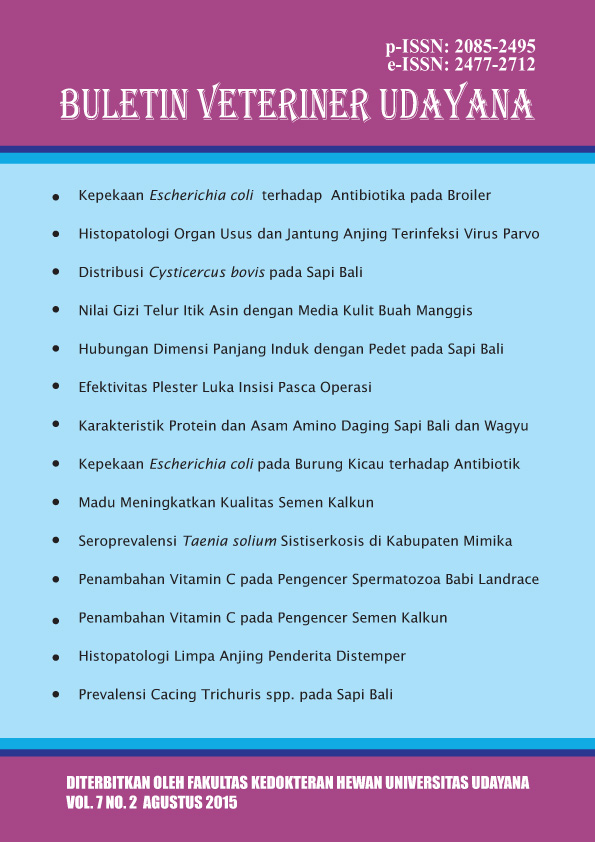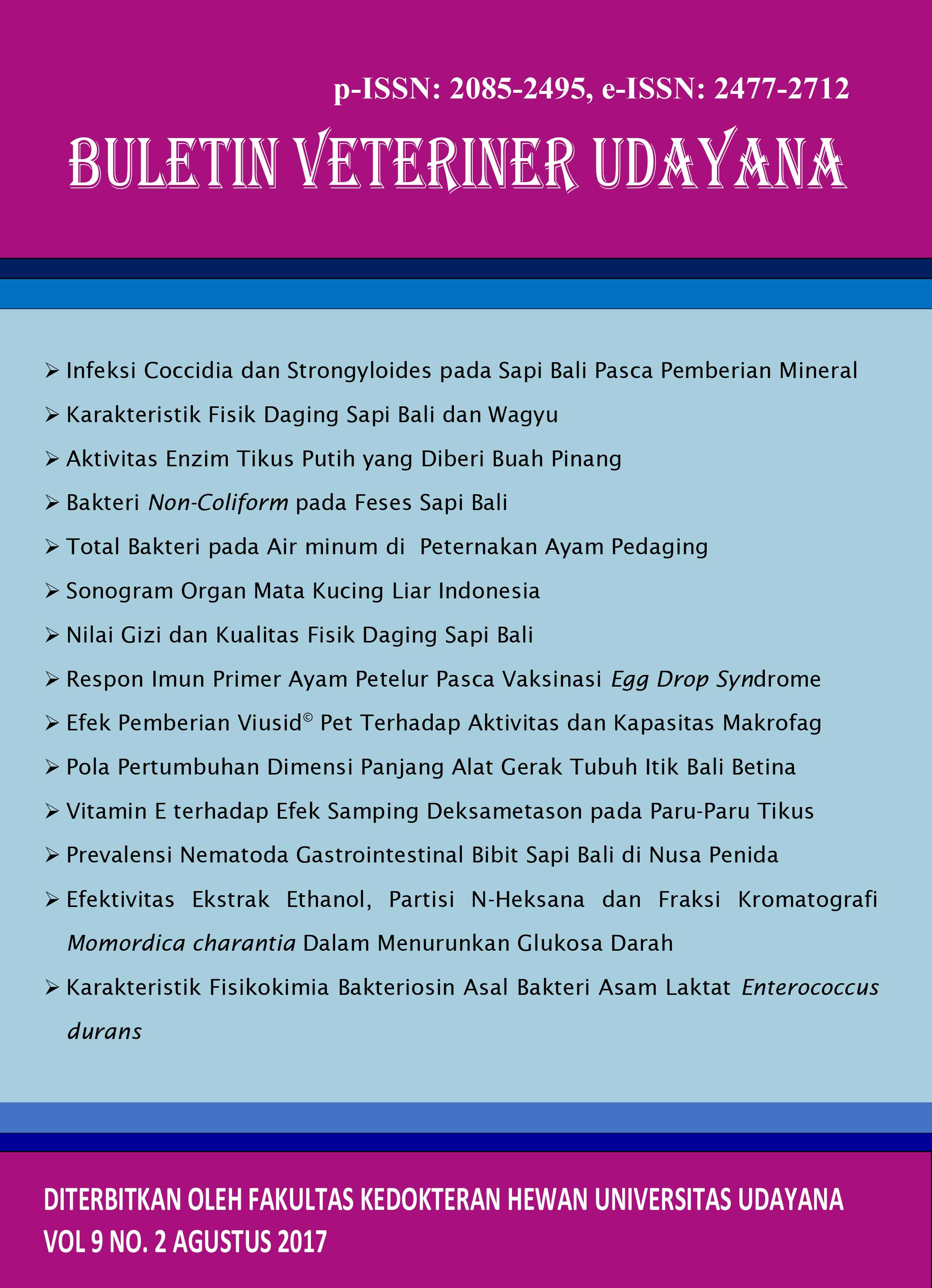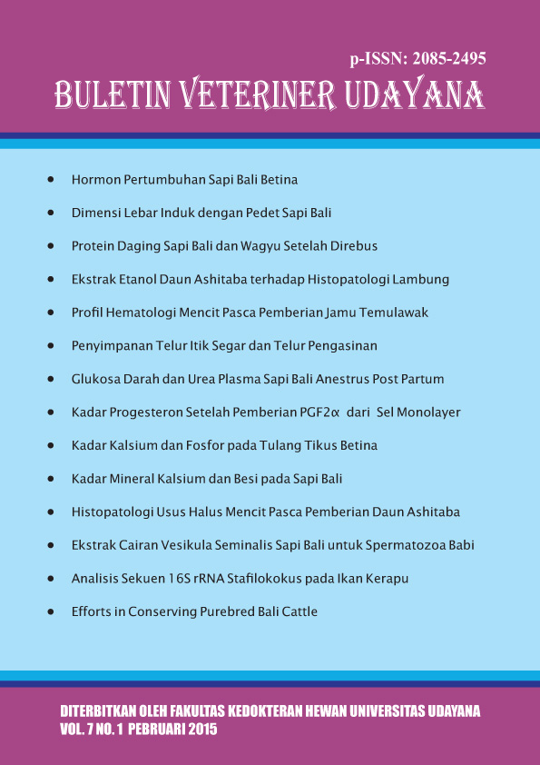 Vol 7 No 2 (2015)This journal is in a collaboration between The Faculty of Veterinary Medicine and Indonesian Small Animal Veterinarian Practitioner Asociation and Indonesian Veterinary Medical Asociation in Region Bali