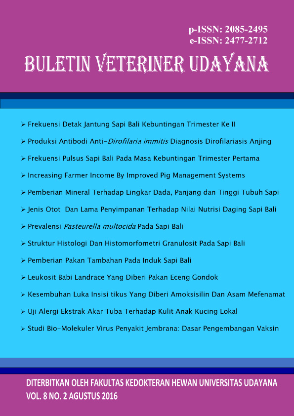 Vol 8 No 2 (2016)This journal is in a collaboration between The Faculty of Veterinary Medicine and Indonesian Small Animal Veterinarian Practitioner Asociation and Indonesian Veterinary Medical Asociation in Region Bali