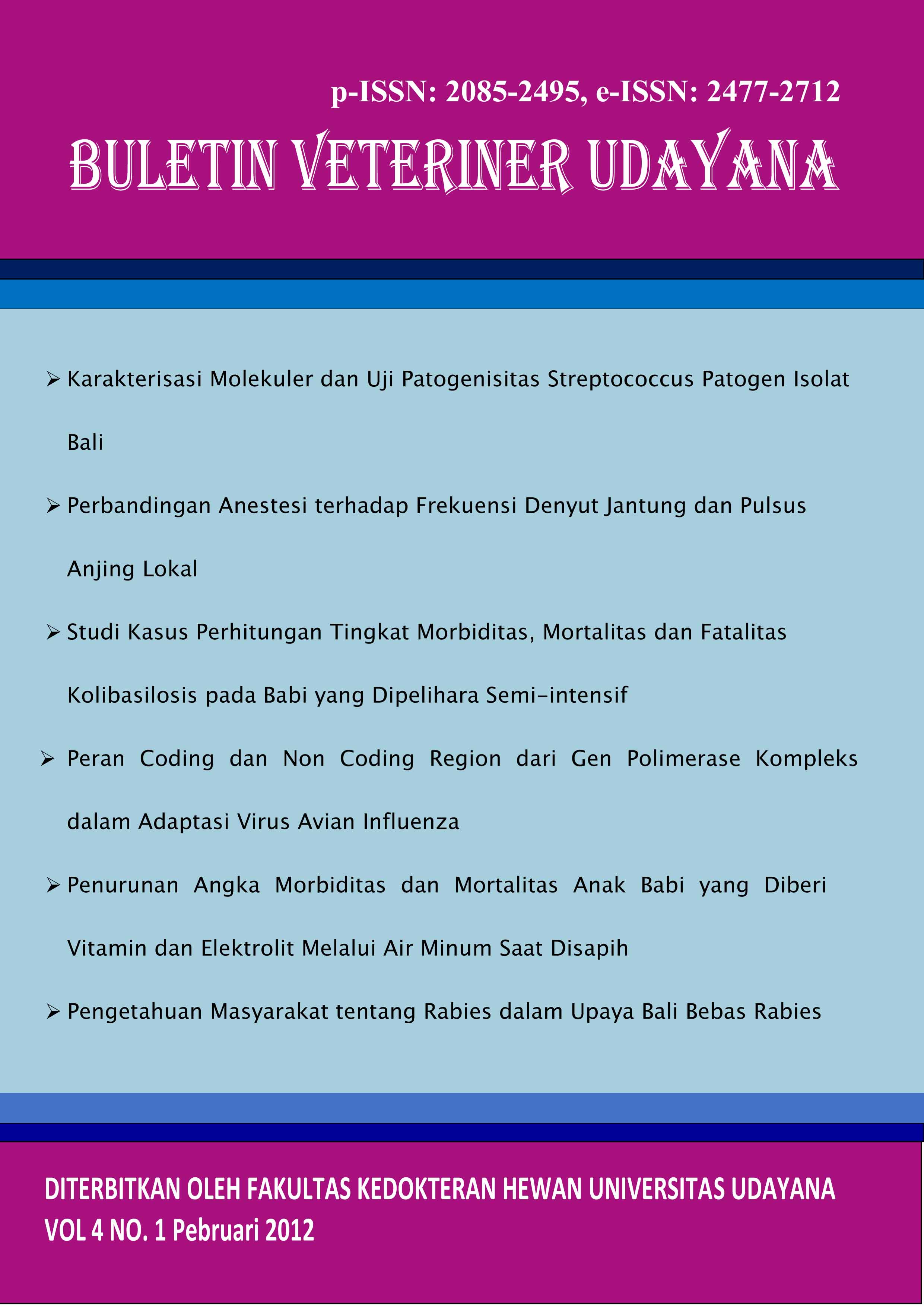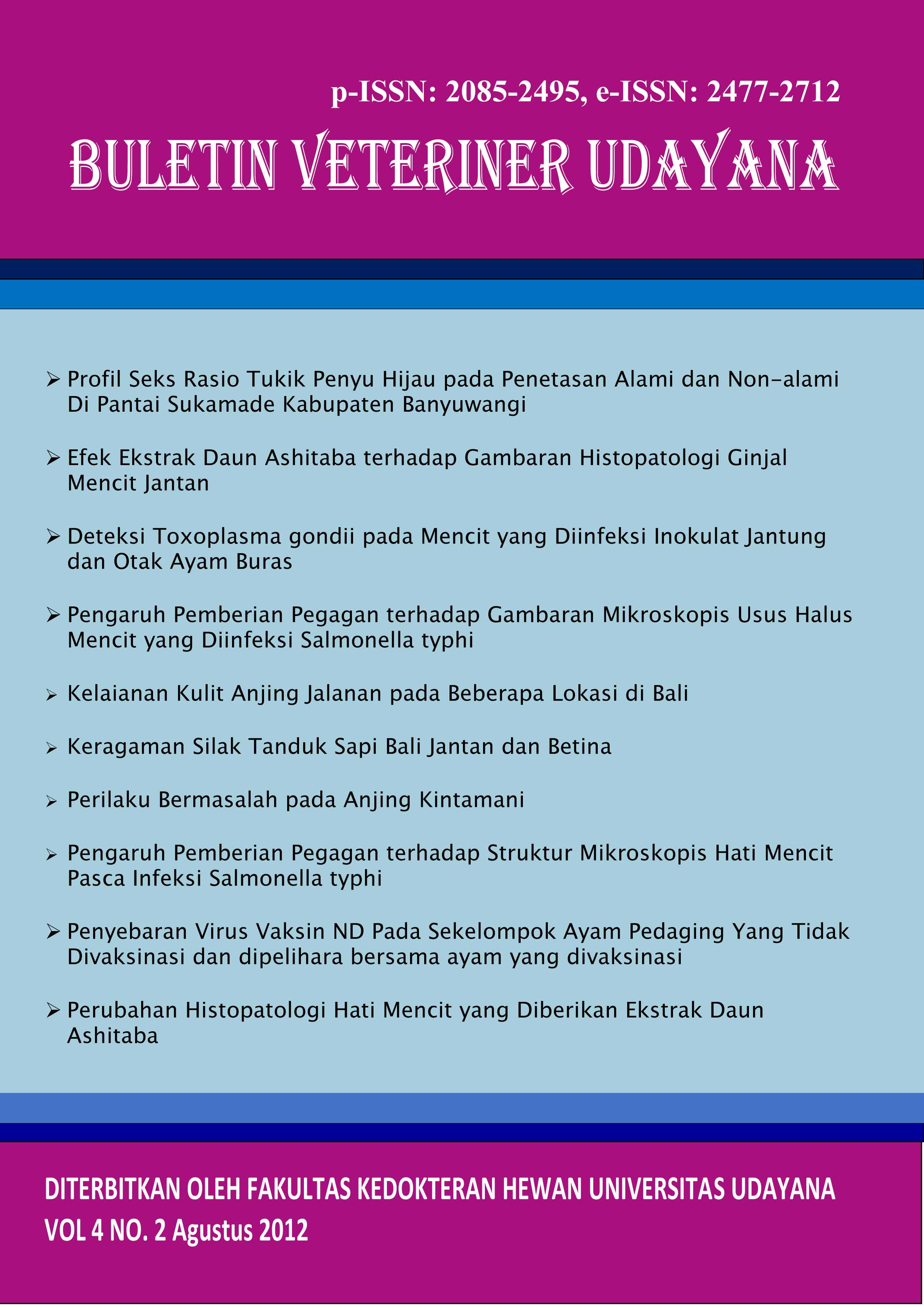 Vol 4 No 2 (2012)This journal is in a collaboration between The Faculty of Veterinary Medicine and Indonesian Small Animal Veterinarian Practitioner Asociation and Indonesian Veterinary Medical Asociation in Region Bali