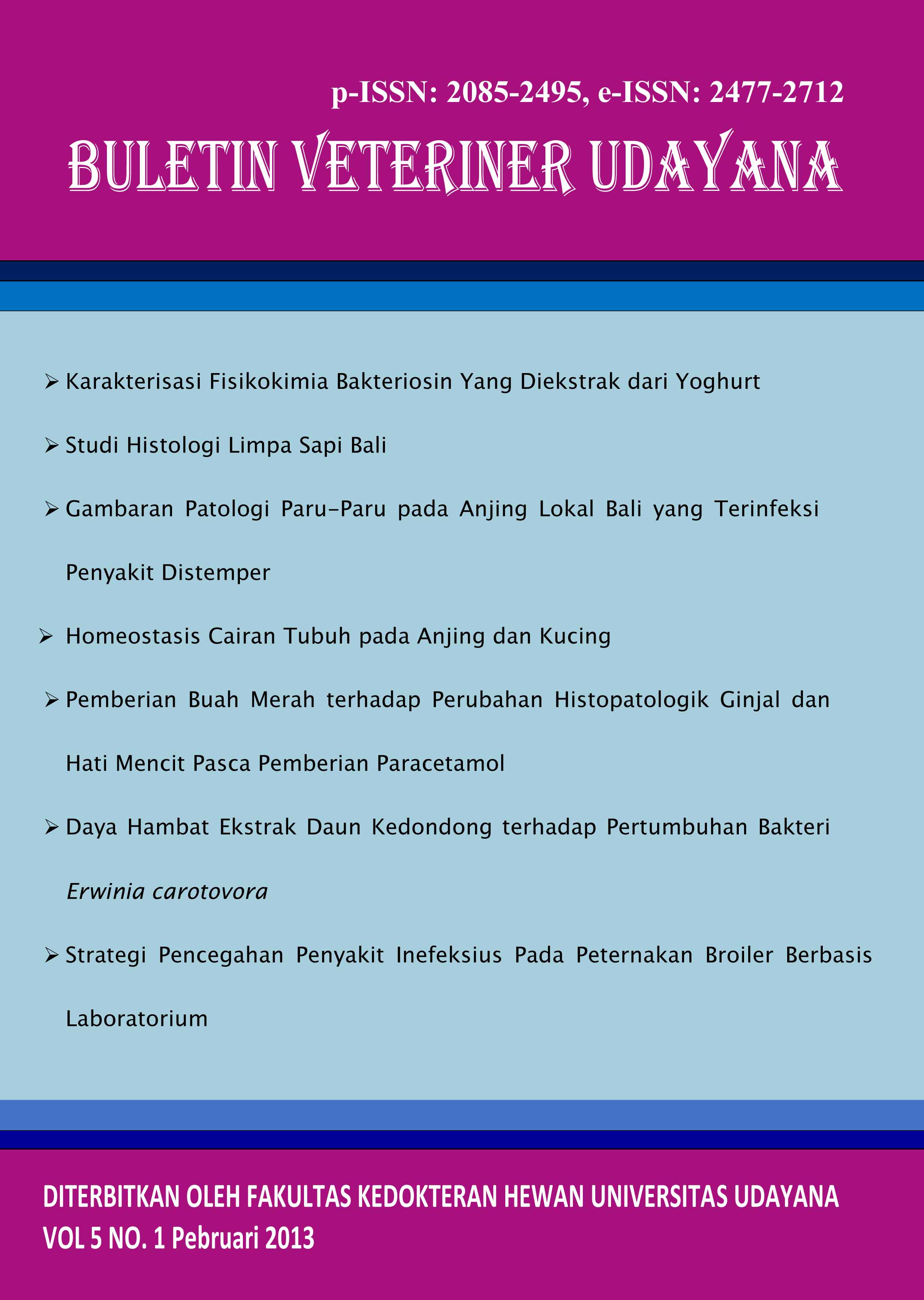Vol 5 No 1 (2013)This journal is in a collaboration between The Faculty of Veterinary Medicine and Indonesian Small Animal Veterinarian Practitioner Asociation and Indonesian Veterinary Medical Asociation in Region Bali