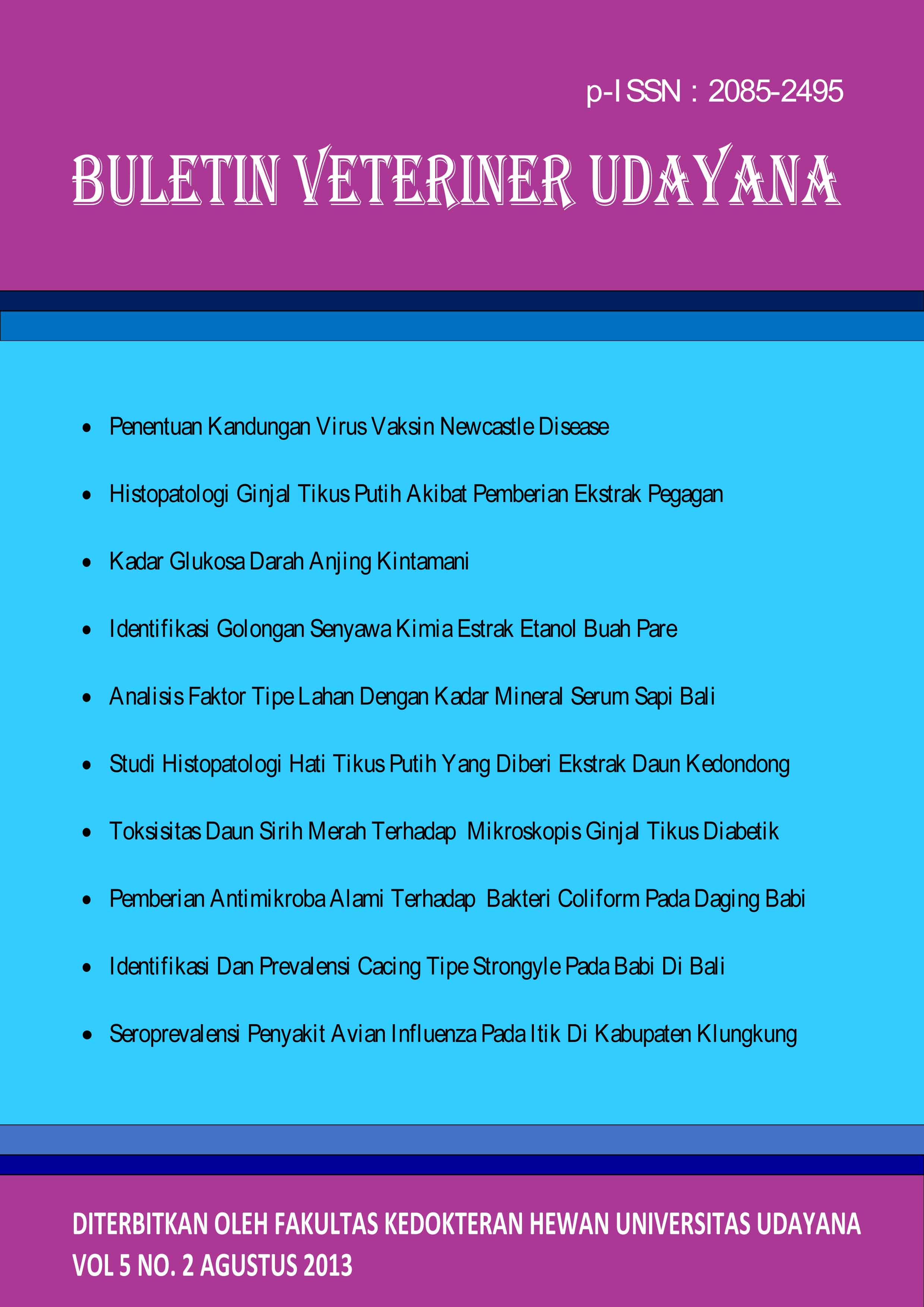 Vol 5 No 2 (2013)This journal is in a collaboration between The Faculty of Veterinary Medicine and Indonesian Small Animal Veterinarian Practitioner Asociation and Indonesian Veterinary Medical Asociation in Region Bali