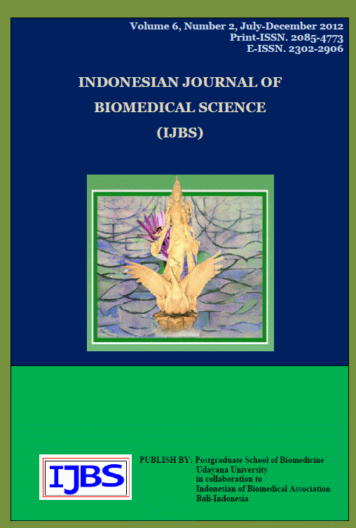 Vol 6 No 2 (2012)Indonesian Journal of Biomedical Sciences (IJBS) is an international journal published twice per year in print and online by Indonesian of Biomedical Association Alumnae in collaboration to Postgraduate School of Biomedicine Udayana University, Bali-Indonesia, located at Postgraduate School Udayana University, Jl P.B. Soedirman, Denpasar Bali-Indonesia.