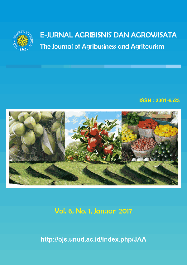 The main problem faced by farmers in shallot cultivation is the pest attack fromworms. Farmers mostly control the pest by using high doses of chemical insecticidespraying. Pheromone technology is a breakthrough technology that can be used tocontrol worm pest in shallot farming, heading to less use of insecticides. Thisresearch took place at the Association of Asta Mandiri Farmer Groups, Songan BVillage, Kintamani District, Bangli Regency which was conducted from April toMay 2016. The purpose of this study was to compare the shallot farming incomeusing pheromone technology and without pheromone technology and the obstaclesfaced by farmers in applying the technology. Data were analyzed using analysis offarm income, the R/C ratio, and t-test. The results showed that the income of shallotfarming with pheromone technology was at Rp 97,597,413.38 per hectare per season,whereas without pheromone technology at Rp 78,605,563.89 per hectare perseason.The R/C ratio of shallot farming by using pheromones technology was 2,39,whereas without the pheromone technology was 2,06. Based on t-test analysis, thereis significantly difference in income at 95% level of confidence. Obstacles faced byfarmers in applying pheromone technology, namely difficulties to obtain thepheromones in the market. It is expected that the government will provide thepheromones massively, so that farmers are able to apply the technology sustainably.