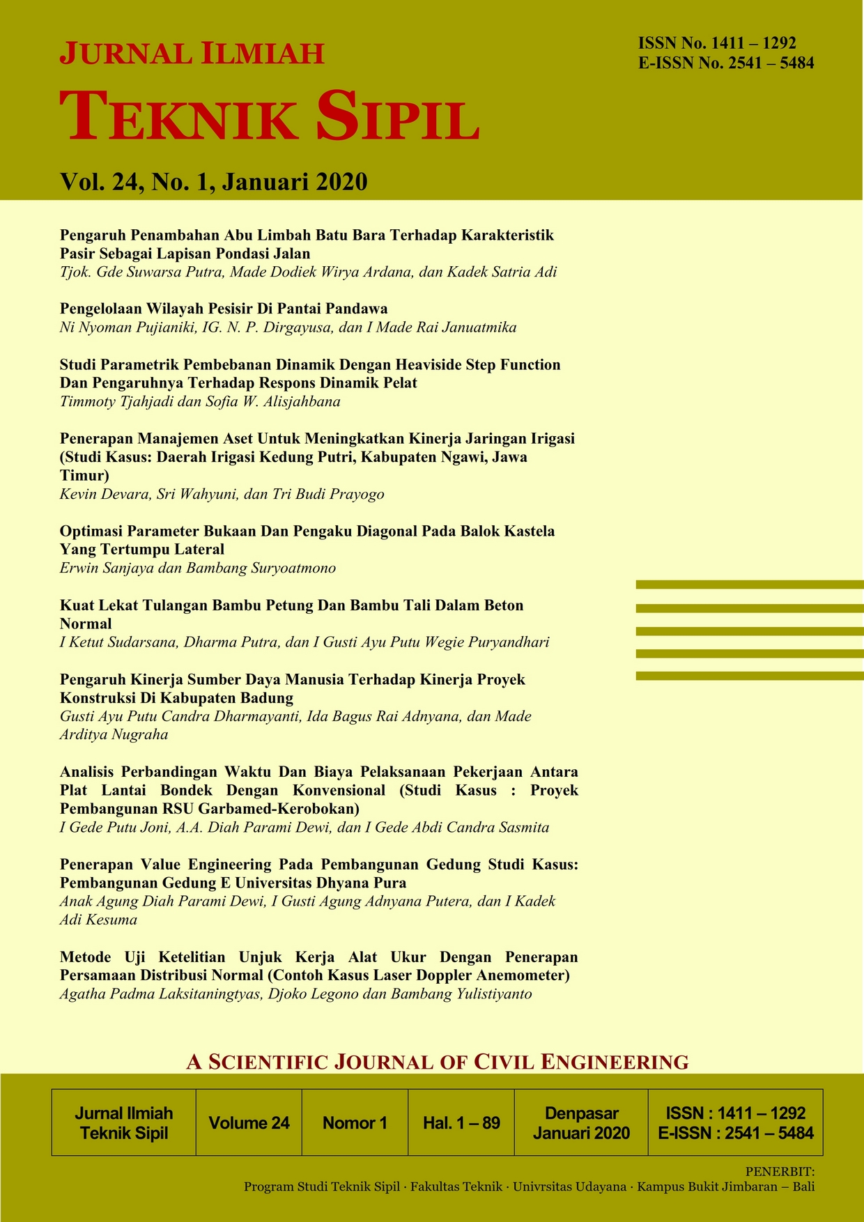 Lapisan pondasi jalan adalah bagian dari perkerasan jalan raya yang terletak di antara lapisan permukaan jalan (surface) dan tanah dasar (subgrade). Pada perkerasan lentur lapisan pondasi jalan memiliki fungsi untuk menyebarkan beban kendaraan yang melintas diatasnya agar tegangan yang sampai ke tanah dasar tidak melampaui tegangan yang dapat menimbulkan deformasi berlebihan. Lapisan pondasi jalan memiliki spesifikasi khusus dalam menentukan material yang akan dipakai, baik ukuran butiran, sifat fisik, maupun nilai daya dukung (CBR) dimana nilai CBR ini merupakan daya dukung dari lapisan pondasi jalan dan sekaligus dapat dipakai acuan dalam menentukan ketebalan lapisan pondasi jalan. Material yang dominan dipakai dalam lapisan pondasi jalan adalah pasir/krikil. Pasir/krikil memiliki ukuran butiran lebih besar dari pada tanah lempung. Ketidak sesuaian material yang dipakai dengan spesifikasi yang digunakan untuk lapisan pondasi jalan, terutama untuk masalah gradasi butiran yang kekurangan butiran halus dapat diatasi dengan penambahan suatu material tertentu yang berguna untuk melengkapi gradasi butiran yang kurang, dan dapat meningkatkan daya dukung (CBR) dari lapisan pondasi jalan. Dalam penelitian ini, bahan yang ditambahkan pada material yang tidak sesuai dengan spesifikasi dari lapisan pondasi jalan adalah abu limbah batu bara, dimana penambahannya akan dicari persentase campuran abu limbah batu bara dengan material yang tidak sesuai dengan spesifikasi lapisan pondasi jalan yang paling bagus untuk masuk spesifikasi gradasi lapisan pondasi jalan. Hasil dari penelitian ini didapatkan persentase penambahan abu limbah batu bara terhadap material tanah yang diuji paling ideal dalam spesifikasi gradasi lapisan pondasi jalan sebesar 13% dari berat kering tanah tersebut. Selain itu dengan penambahan abu limbah batu bara menghasilkan kerapatan relatif dari tanah dan kepadatan tanah semakin meningkat, oleh karena itu nilai CBR dari tanah juga semakin meningkat. Dimana sebelum ditambahkan abu limbah batu bara nilai CBR tanah sebesar 62%, namun setelah ditambahkan abu limbah batu bara nilai CBR mengalami peningkatan menjadi 94%.