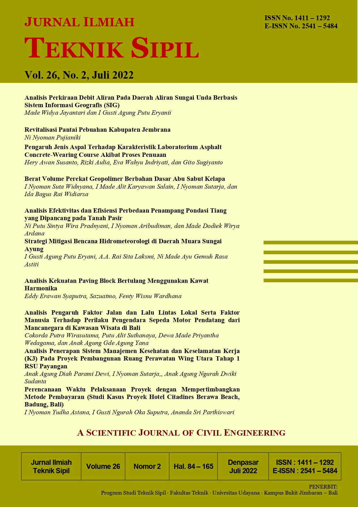 Keterbatasan data aliran merupakan kendala yang sering terjadi di dalam analisis ketersediaan air. Untuk mendapatkan data tersebut dewasa kini sudah banyak model-model prediksi debit aliran. Teknologi penginderaan jauh (remote sensing technology) dapat meningkatkan pengembangan studi model hubungan curah hujan–limpasan secara konvensional. Dengan teknologi ini dapat membantu dalam memprediksi debit limpasan untuk tiap Sub-DAS. DAS Unda merupakan salah satu DAS Potensial di Provinsi Bali. Analisis debit aliran ini dilakukan dengan metode overlay dengan mengoverlay peta tata guna lahan dan peta jenis tanah di DAS Unda sehingga mendapatkan nilai CN kemudian dilanjutkan dengan menghitung debit aliran prediksi menggunakan metode SSCN. Dari analisis dalam sepuluh tahun terakhir terjadi fluktuasi debit, dimana debit terbesar yang pernah terjadi adalah 10.569 m3/dtk pada tahun 2013 di subdas Telagawaja dan terendah sebesar 0,079 m3/dtk di subdas Tanah pada tahun 2010. Untuk subdas Telagawaja dalam sepuluh tahun terakhir debit rata-ratanya sebesar 8,068 m3/dtk, subdas Masin sebesar 0,963 m3/dtk, subdas Tanah sebesar 0,163 m3/dtk, subdas Nyuling sebesar 0,705 m3/dtk, subdas Kaun sebesar 1,653 m3/dtk, subdas Yeh Batah sebesar 0,564 m3/dtk, subdas Unda sebesar 1,722 m3/dtk, dan subdas Sangsang sebesar 0,764 m3/dtk