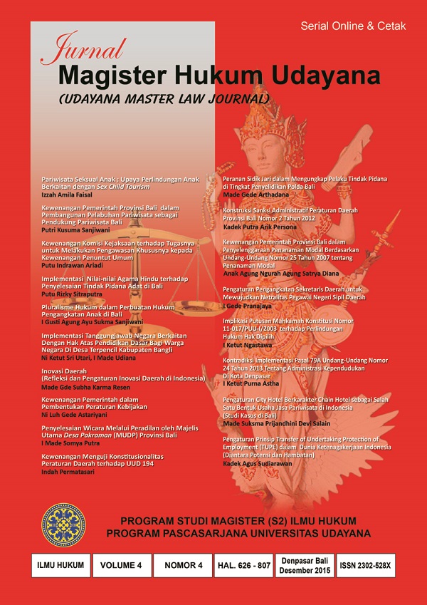 Jurnal Magister Hukum Udayana (Udayana Master Law of Journal) by Faculty of Law Udayana University is licensed under a Creative Commons Attribution-NonCommercial 4.0 International License.