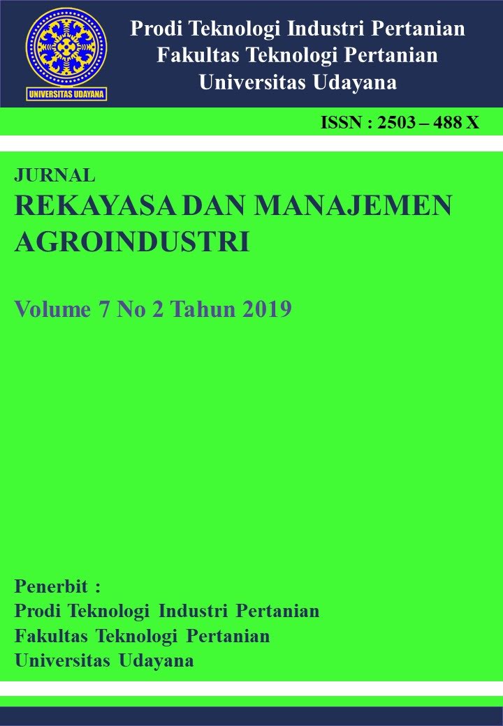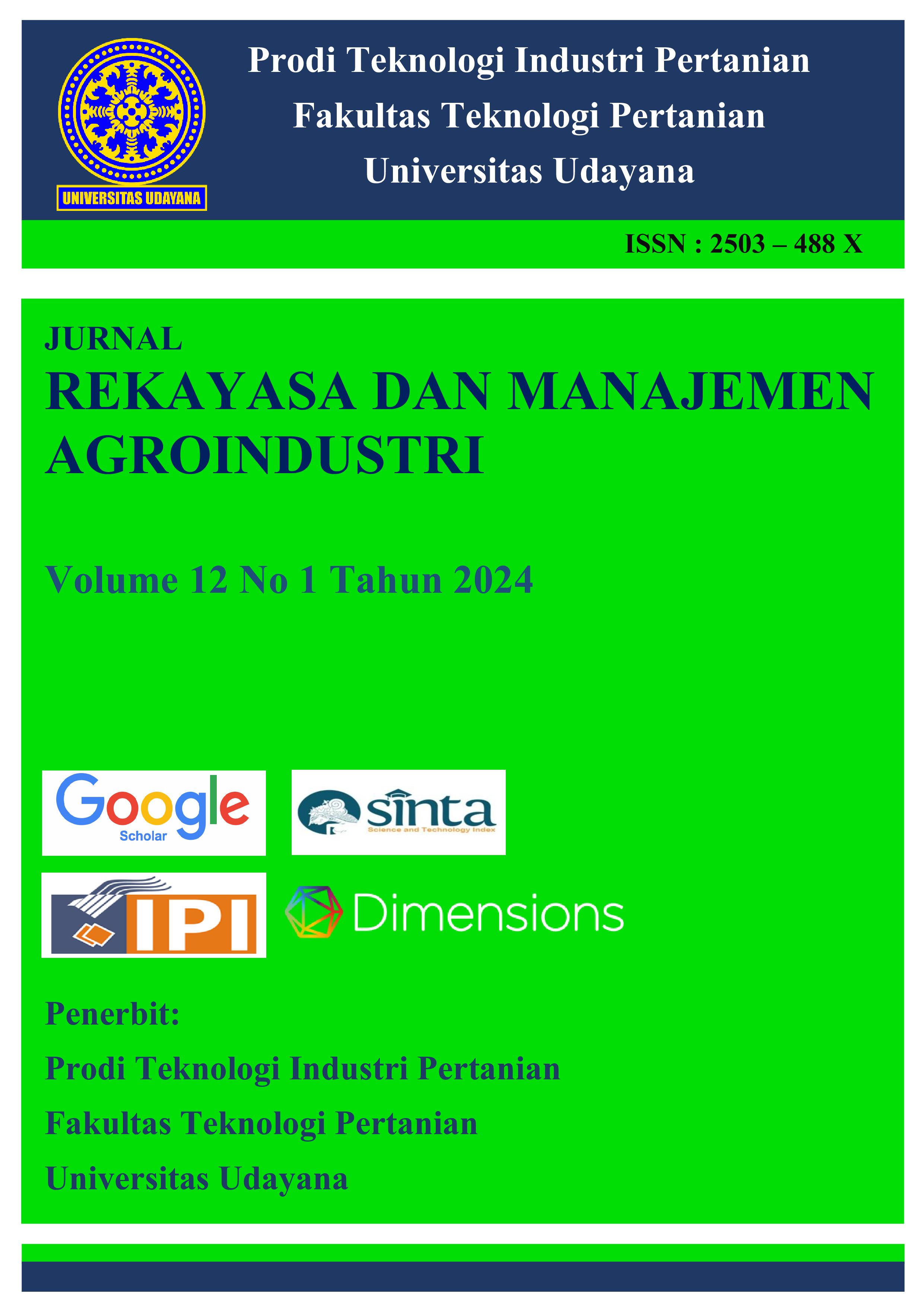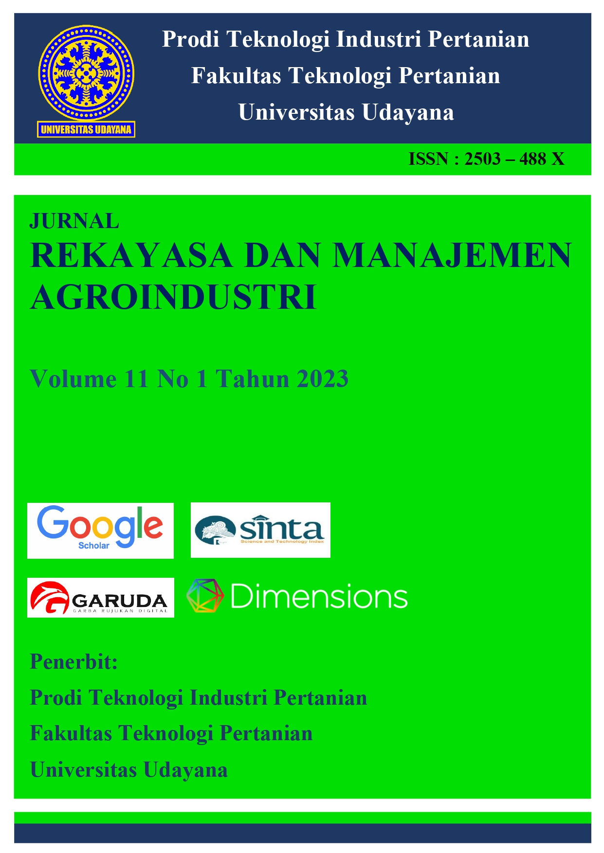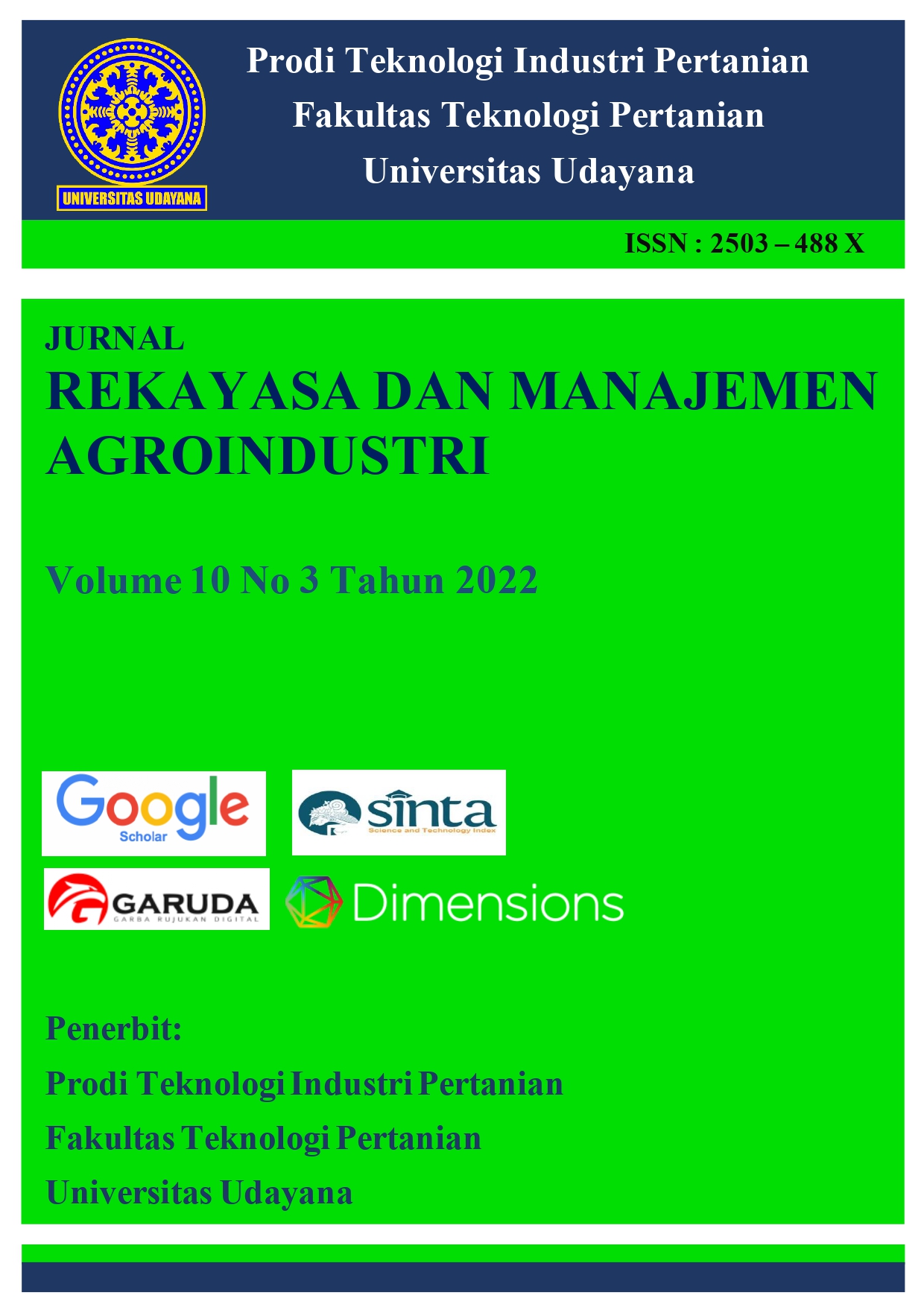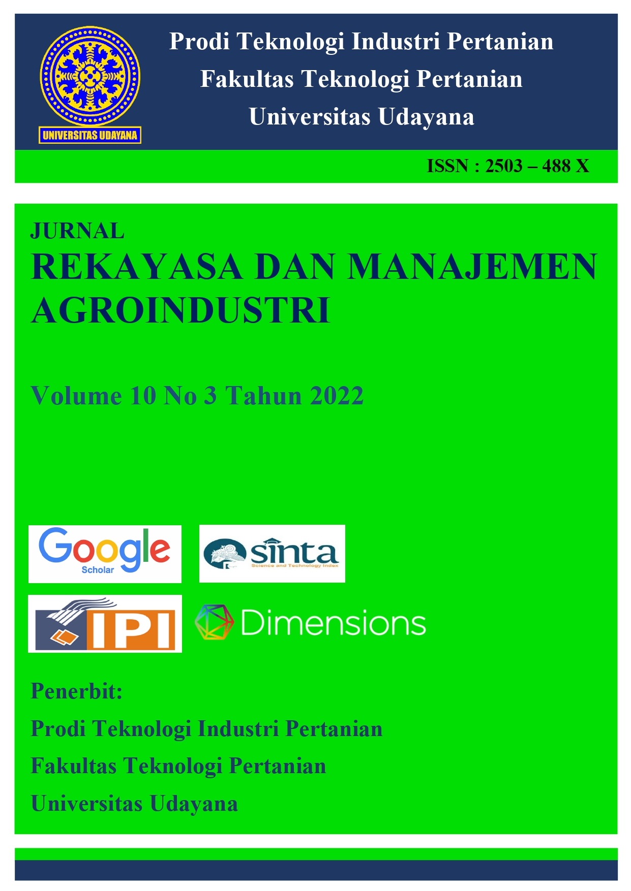 Vol 10 No 3 (2022)JURNAL REKAYASA DAN MANAJEMEN AGROINDUSTRI adalah media publikasi ilmiah yang diterbitkan oleh Program Studi Teknologi Industri Pertanian, Fakultas Teknologi Pertanian-Universitas Udayana, berisikan artikel hasil-hasil penelitian, ulasan (review), opini ilmiah oleh mahasiswa, dosen, praktisi, dan ahli di bidang rekayasa dan manajemen bidang keilmuan Teknologi Industri Pertanian dan keilmuan yang terkait lainnya.