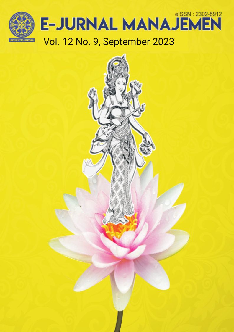 Vol 12 No 10 (2023)E-Jurnal Manajemen (e-ISSN 2302-8912) merupakan jurnal ilmiah elektronik yang diterbitkan secara daring dengan frekuensi bulanan. Jurnal ini bertujuan untuk meningkatkan kualitas keilmuan serta menjadi wadah bagi akademisi, mahasiswa, praktisi, dan pemerhati ilmu pengetahuan dalam bidang manajemen untuk berbagi dan menyebarluaskan hasil penelitian serta kajian ilmiah.