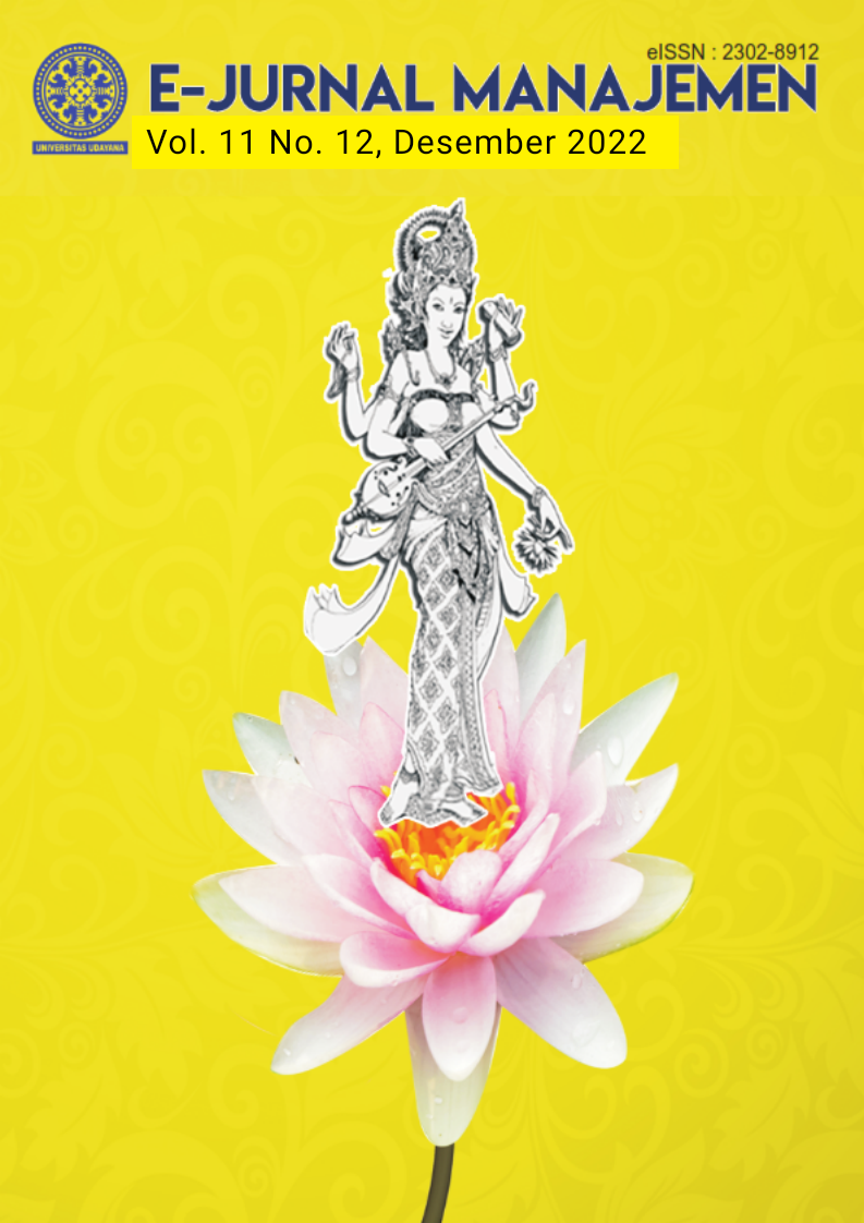 Vol 11 No 11 (2022)E-Jurnal Manajemen (e-ISSN 2302-8912) merupakan jurnal ilmiah elektronik yang diterbitkan secara daring dengan frekuensi bulanan. Jurnal ini bertujuan untuk meningkatkan kualitas keilmuan serta menjadi wadah bagi akademisi, mahasiswa, praktisi, dan pemerhati ilmu pengetahuan dalam bidang manajemen untuk berbagi dan menyebarluaskan hasil penelitian serta kajian ilmiah.