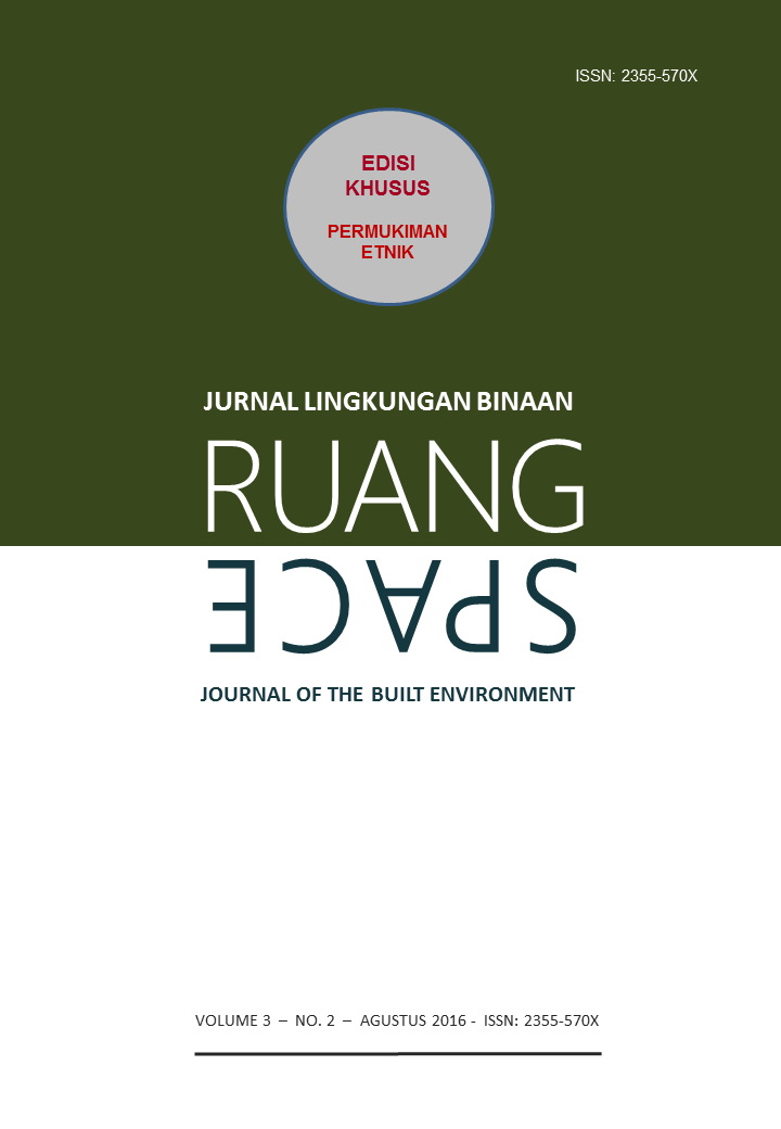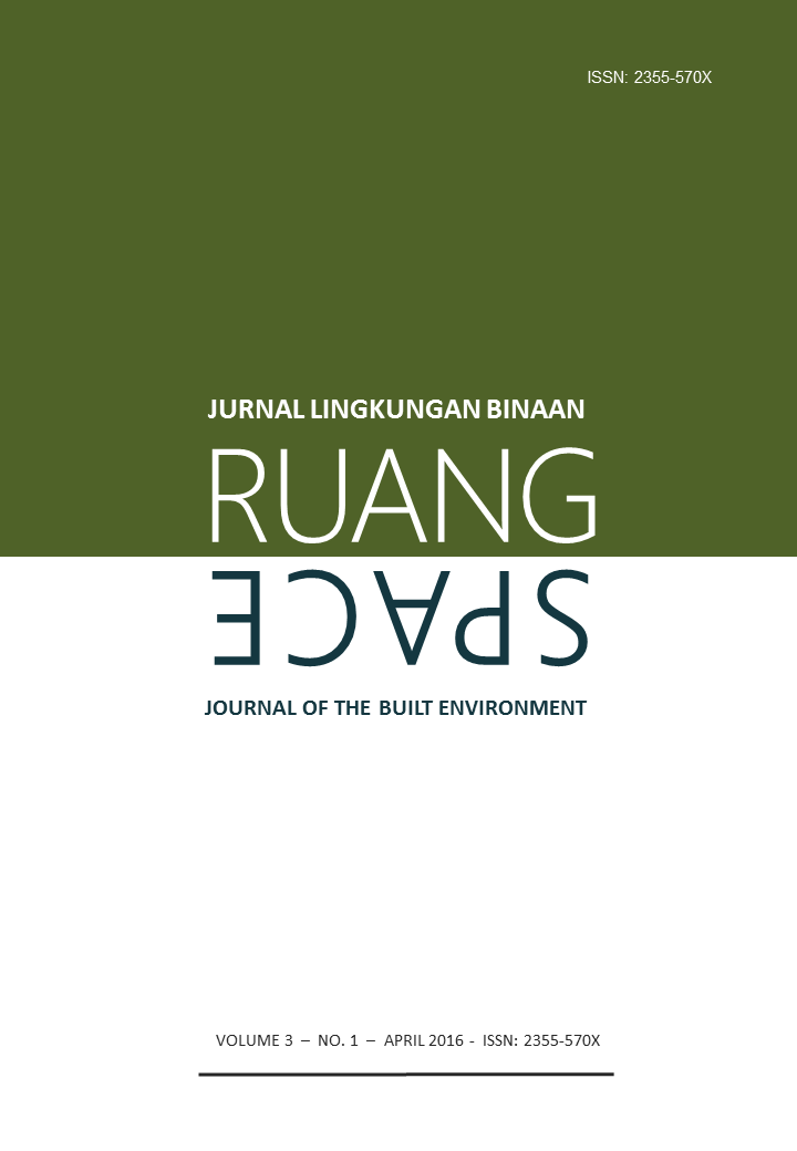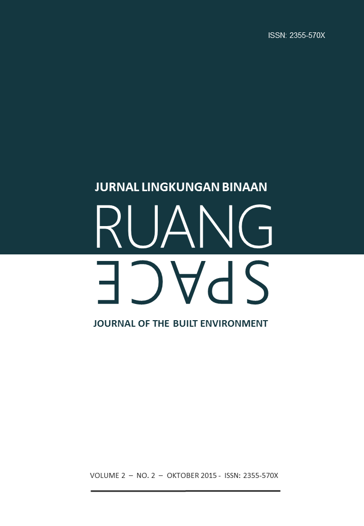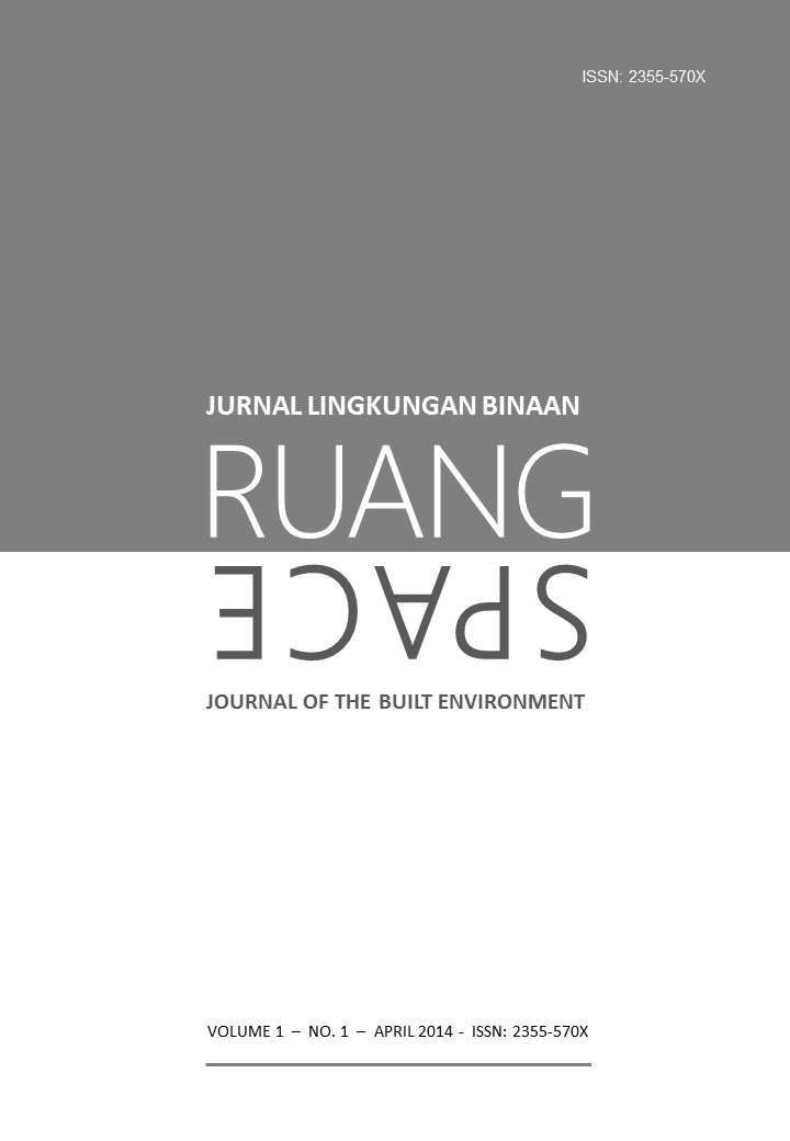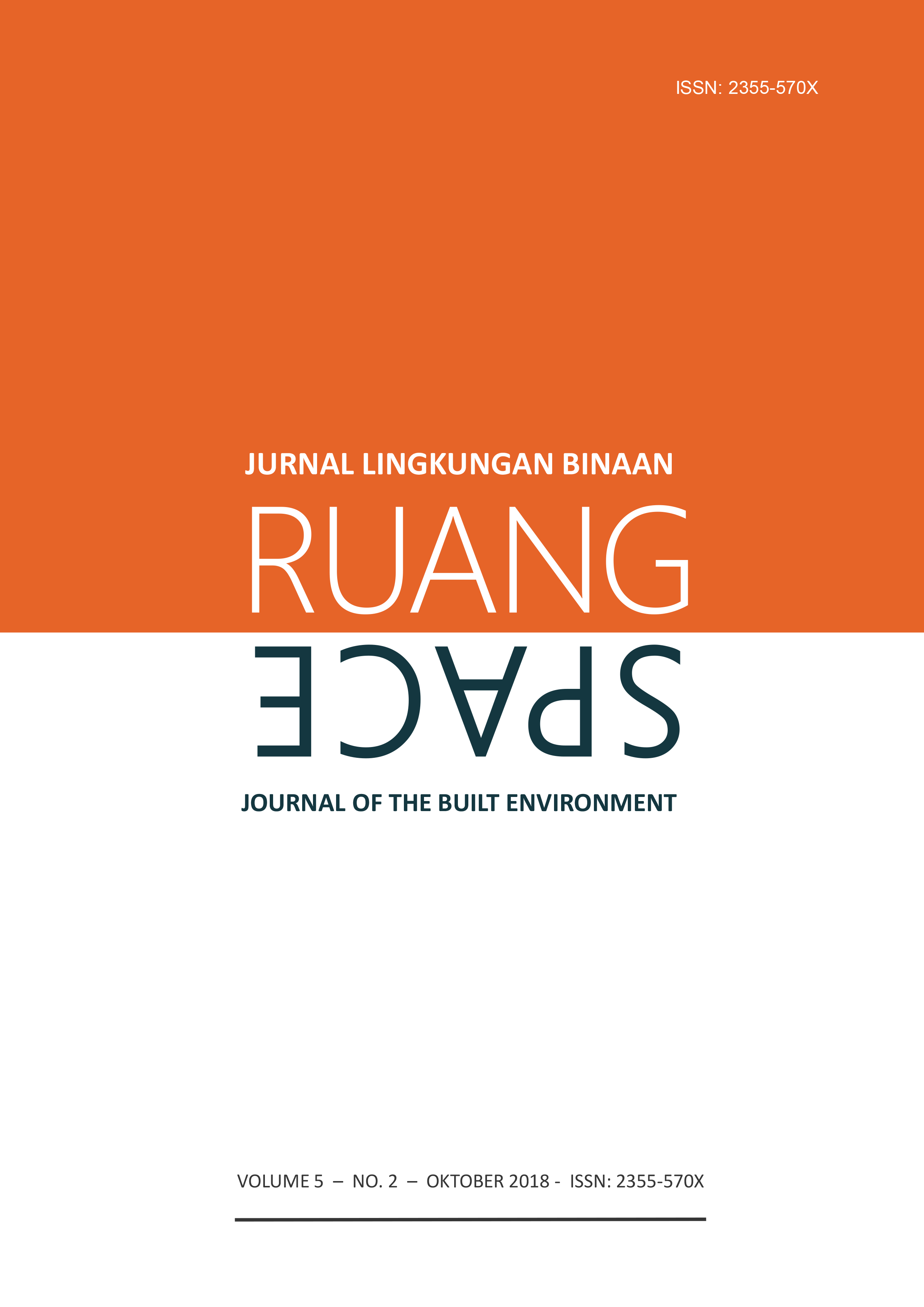 Vol 5 No 2 (2018)RUANG: Jurnal Lingkungan Binaan (SPACE: Journal of the Built Environment) [E-ISSN 2355-570X | P-ISSN 2355-5718 | DOI 10.24843] is a refereed journal which addresses the built environment. It includes publications pertaining to topics on development and planning; human settlements; conservation of the built environment; urban design; and ethnic built environment. It publishes articles documented as a result of research activities, the development of new theory; study of the existing theories or the implementation of certain conceptual systems. The Journal is published twice a year, in April and October, by Udayana University.