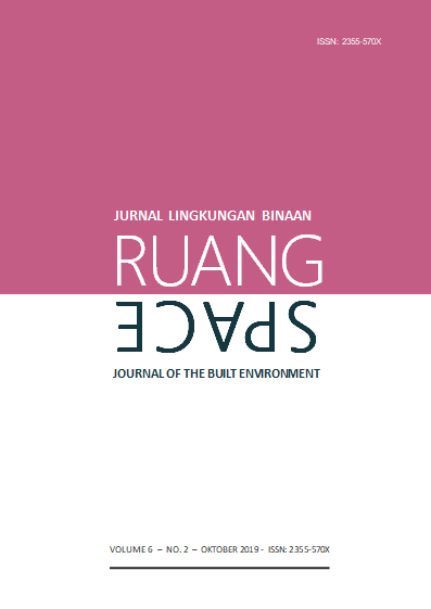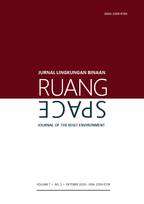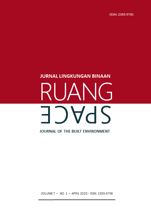 Vol 7 No 2 (2020)RUANG: Jurnal Lingkungan Binaan (SPACE: Journal of the Built Environment) [E-ISSN 2355-570X | P-ISSN 2355-5718 | DOI 10.24843] is a refereed journal which addresses the built environment. It includes publications pertaining to topics on development and planning; human settlements; conservation of the built environment; urban design; and ethnic built environment. It publishes articles documented as a result of research activities, the development of new theory; study of the existing theories or the implementation of certain conceptual systems. The Journal is published twice a year, in April and October, by Udayana University.