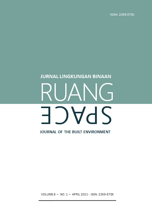 Vol 8 No 1 (2021)RUANG: Jurnal Lingkungan Binaan (SPACE: Journal of the Built Environment) [E-ISSN 2355-570X | P-ISSN 2355-5718 | DOI 10.24843] is a refereed journal which addresses the built environment. It includes publications pertaining to topics on development and planning; human settlements; conservation of the built environment; urban design; and ethnic built environment. It publishes articles documented as a result of research activities, the development of new theory; study of the existing theories or the implementation of certain conceptual systems. The Journal is published twice a year, in April and October, by Udayana University.