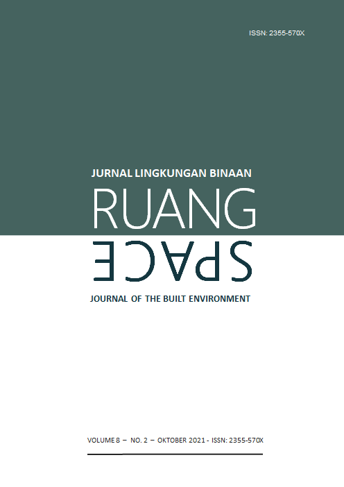 Vol 8 No 2 (2021)RUANG: Jurnal Lingkungan Binaan (SPACE: Journal of the Built Environment) [E-ISSN 2355-570X | P-ISSN 2355-5718 | DOI 10.24843] is a refereed journal which addresses the built environment. It includes publications pertaining to topics on development and planning; human settlements; conservation of the built environment; urban design; and ethnic built environment. It publishes articles documented as a result of research activities, the development of new theory; study of the existing theories or the implementation of certain conceptual systems. The Journal is published twice a year, in April and October, by Udayana University.