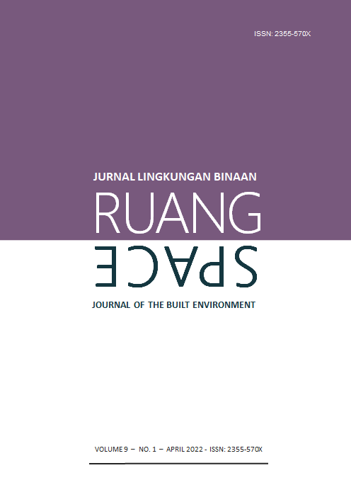 Vol 9 No 1 (2022)RUANG: Jurnal Lingkungan Binaan (SPACE: Journal of the Built Environment) [E-ISSN 2355-570X | P-ISSN 2355-5718 | DOI 10.24843] is a refereed journal which addresses the built environment. It includes publications pertaining to topics on development and planning; human settlements; conservation of the built environment; urban design; and ethnic built environment. It publishes articles documented as a result of research activities, the development of new theory; study of the existing theories or the implementation of certain conceptual systems. The Journal is published twice a year, in April and October, by Udayana University.