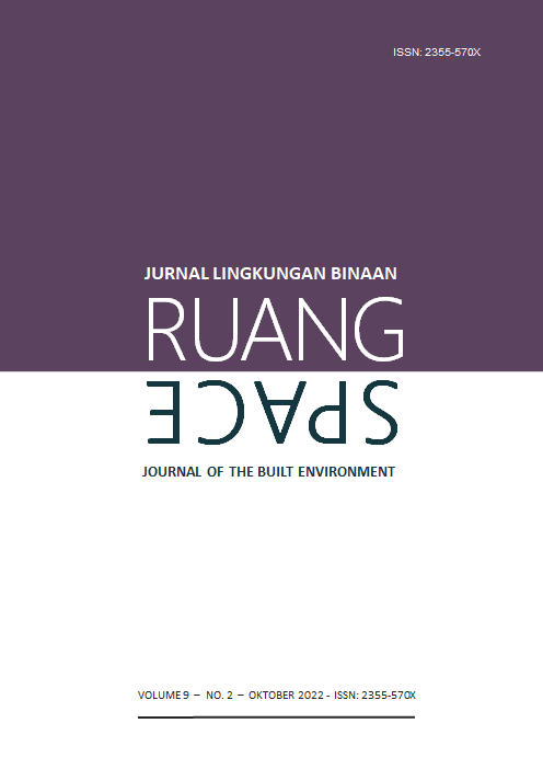 Vol 9 No 2 (2022)RUANG: Jurnal Lingkungan Binaan (SPACE: Journal of the Built Environment) [E-ISSN 2355-570X | P-ISSN 2355-5718 | DOI 10.24843] is a refereed journal which addresses the built environment. It includes publications pertaining to topics on development and planning; human settlements; conservation of the built environment; urban design; and ethnic built environment. It publishes articles documented as a result of research activities, the development of new theory; study of the existing theories or the implementation of certain conceptual systems. The Journal is published twice a year, in April and October, by Udayana University.