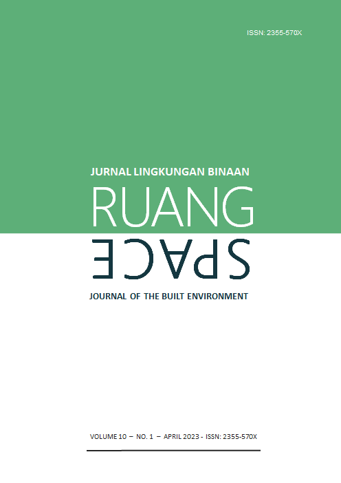 Vol 10 No 1 (2023)RUANG: Jurnal Lingkungan Binaan (SPACE: Journal of the Built Environment) [E-ISSN 2355-570X | P-ISSN 2355-5718 | DOI 10.24843] is a refereed journal that addresses the built environment. It includes publications pertaining to topics on development and planning; human settlements; conservation of the built environment; urban design; and the ethnic built environment. It publishes articles documented as a result of research activities, the development of new theories, the study of existing theories, or the implementation of certain conceptual systems. The Journal is published twice a year, in April and October, by Udayana University.