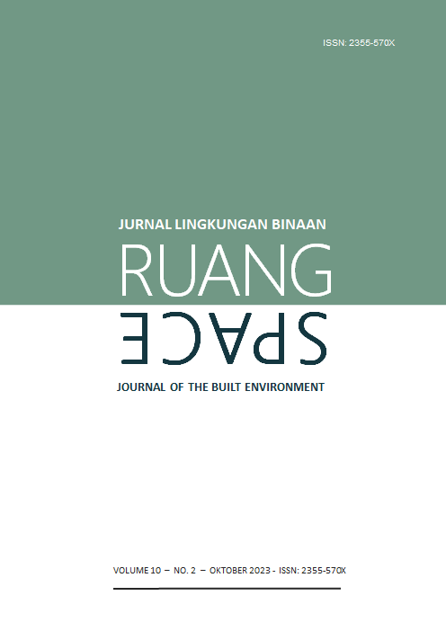 Vol 10 No 2 (2023)RUANG: Jurnal Lingkungan Binaan (SPACE: Journal of the Built Environment) [E-ISSN 2355-570X | P-ISSN 2355-5718 | DOI 10.24843] is a refereed journal that addresses the built environment. It includes publications pertaining to topics on development and planning; human settlements; conservation of the built environment; urban design; and the ethnic built environment. It publishes articles documented as a result of research activities, the development of new theories, the study of existing theories, or the implementation of certain conceptual systems. The Journal is published twice a year, in April and October, by Udayana University.