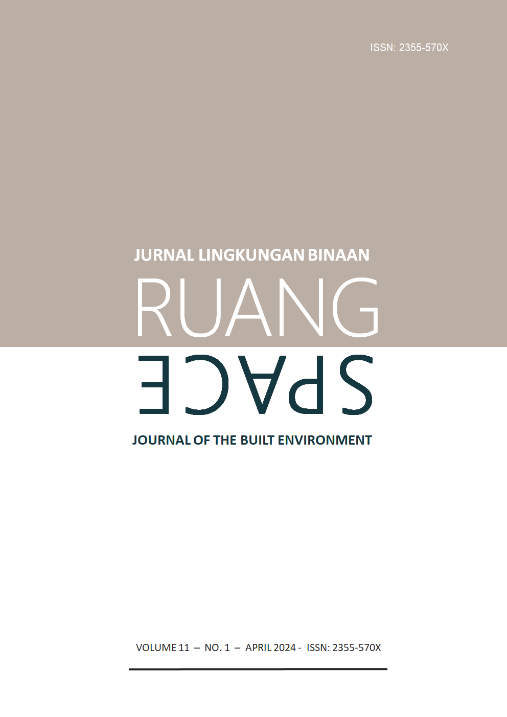 Vol 11 No 1 (2024)RUANG: Jurnal Lingkungan Binaan (SPACE: Journal of the Built Environment) [E-ISSN 2355-570X | P-ISSN 2355-5718 | DOI 10.24843] is a refereed journal that addresses the built environment. It includes publications pertaining to topics on development and planning; human settlements; conservation of the built environment; urban design; and the ethnic built environment. It publishes articles documented as a result of research activities, the development of new theories, the study of existing theories, or the implementation of certain conceptual systems. The Journal is published twice a year, in April and October, by Udayana University.